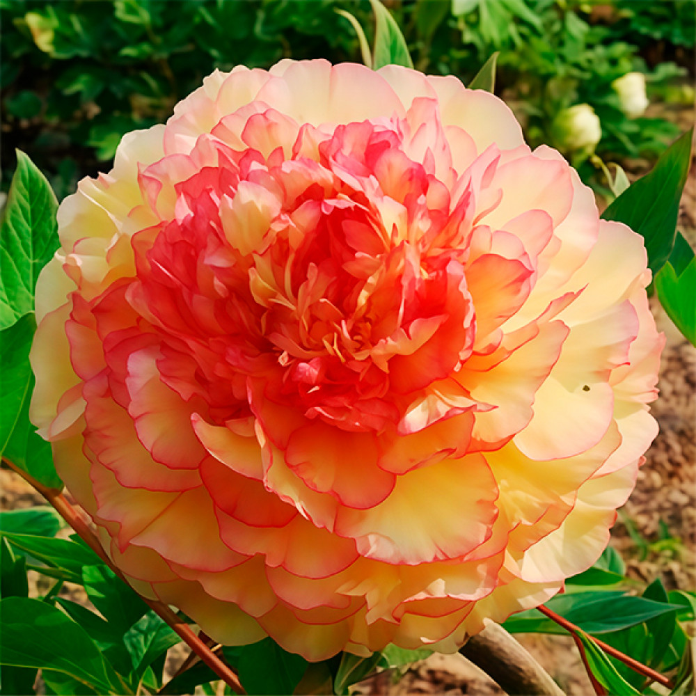 Листья крупные, ярко-зеленые. Цветки имеют шаровидную форму, густомахровые, желтовато-персикового цвета с нежно-розовой каемкой по краю лепестка. Цветение продолжительное: две недели и более. Бывает повторное цветение. Корень пиона привит на травянистый.